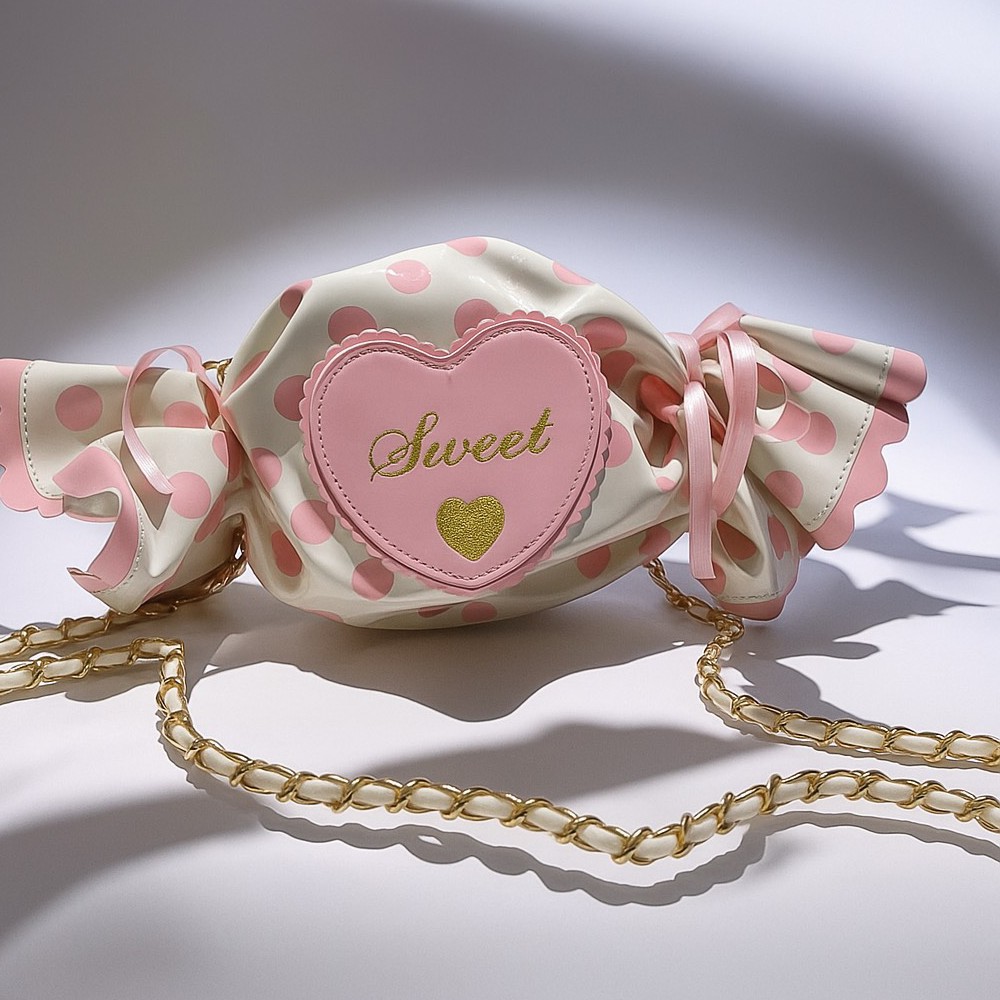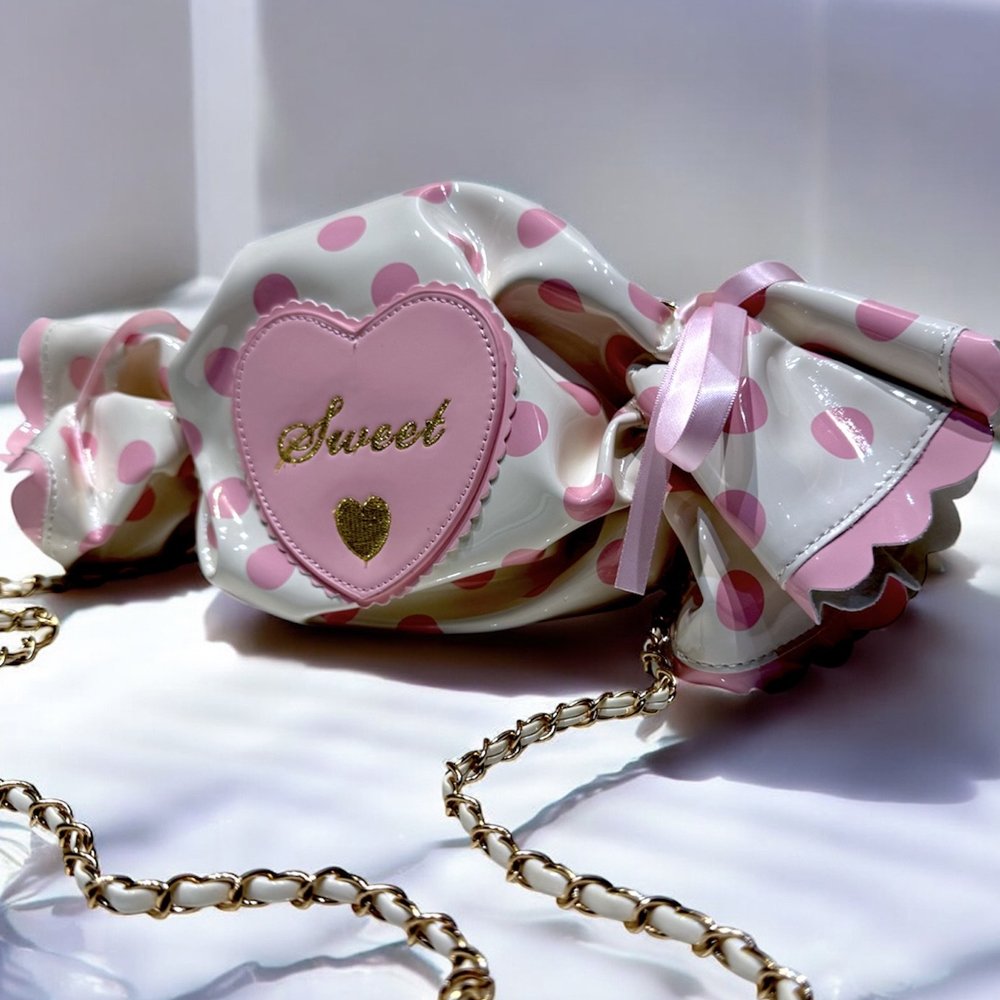 Unwrap joy with the Sweet Treat handbag — a whimsical, candy-shaped delight wrapped in playful polka dots and finished with a glossy heart patch. With its charming gold chain strap and scalloped edges, it’s the perfect accessory for those who love a little fun with their fashion. Ideal for birthdays, brunches, or any day that needs a sprinkle of cuteness.