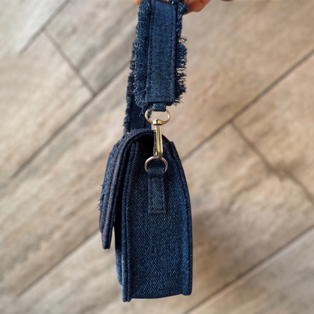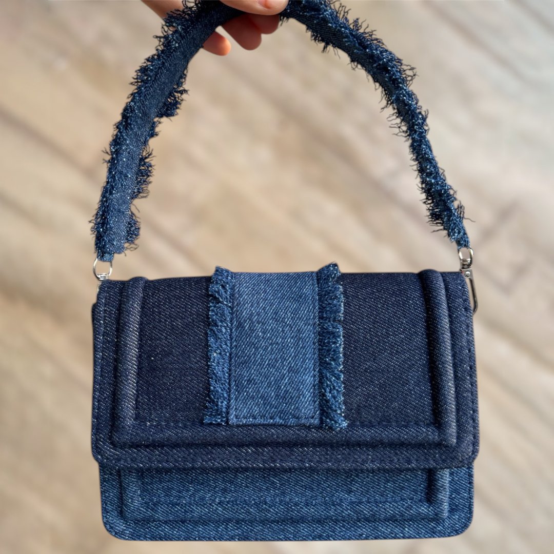 This classy denim handbag blends structured elegance with a touch of playful texture. Made entirely from denim it features a rectangular silhouette with softly padded panels and clean stitching lines. The standout detail is its frayed denim top handle, adding a raw, fashion-forward edge to the otherwise polished design. A central vertical denim strap, also frayed on the edges, adds dimension and ties the look together. Perfect for casual outings or adding a modern twist to minimalist outfits
