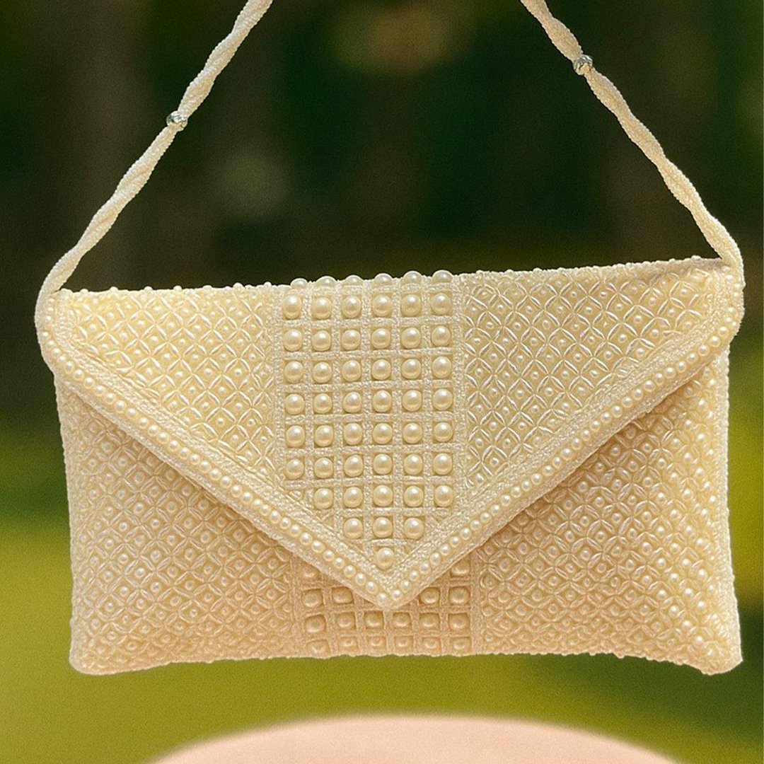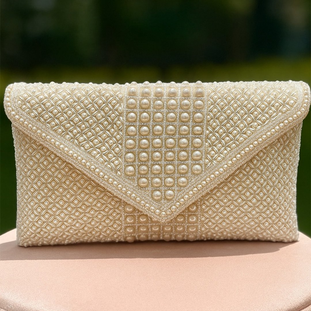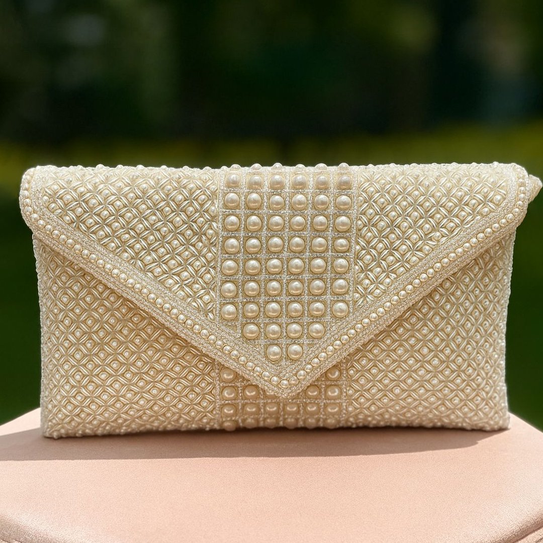 Elevate your festive and bridal look with this elegant PEARL AURA COLLECTION embellished envelope clutch. Featuring a delicate hand-beaded geometric pattern and central pearl panel, this clutch perfectly blends tradition with timeless charm. It has a pearl handle which makes it easier to carry .A must-have for weddings, festive celebrations, and special evening occasions.